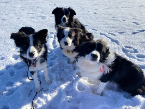 Winter 2026 mit seinen schönen Seiten. Kara(vo.li.) Ziggy (hi.), Galaxy (vo. re.) und Biene (Mitte)